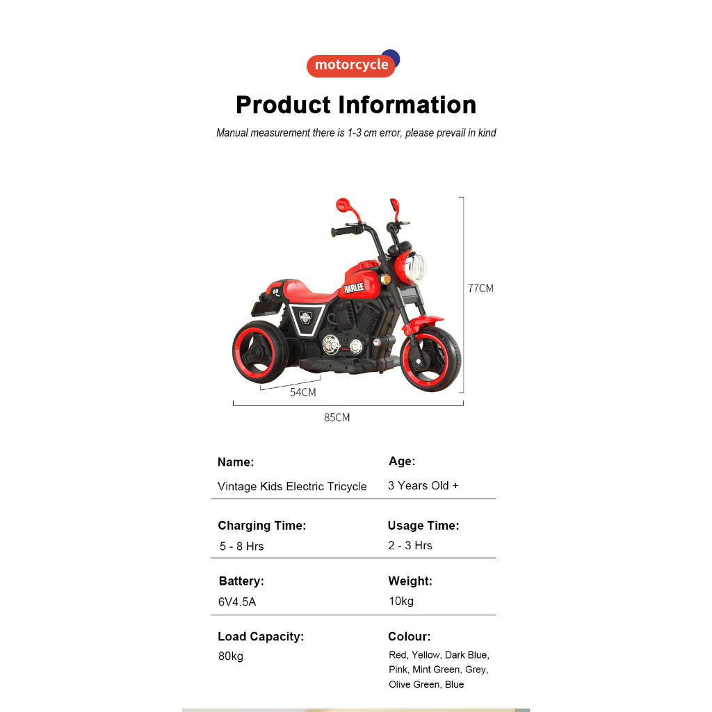 【SG Ready Stock】Vintage Mini Harley Kid's Electric Tricycle★8 Colours Availble!▶FREE INSTALLATION◀Children Ride-on Toy