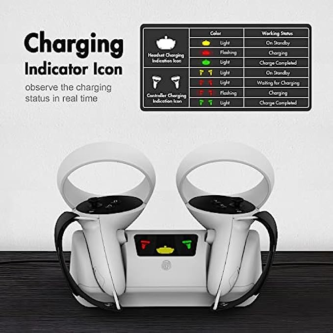• Fast and Safe Charging -- The Charging Station for Oculus Quest 2 charges the VR headset first, then the Oculus Quest 2 controllers. Our product only takes 3 hours to fully charge the quest 2 touch controllers with wrist straps. Included 2* rechargeable AA batteries have built-in overcharge protection, No heat and very durable, no harm to your VR controllers