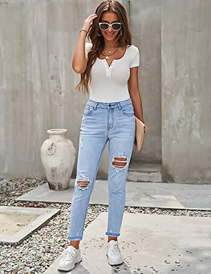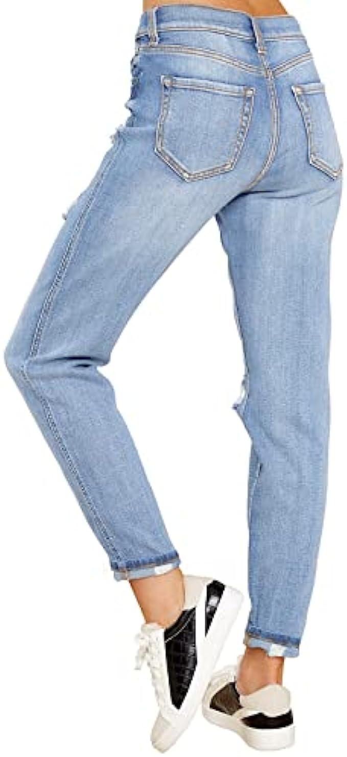 • These high rise distressed jeans for women are featured in relaxed fit, tapered leg and ankle length with optional rolled cuffs. Stretchy mom jeans are sure to flatter your curves perfectly.
