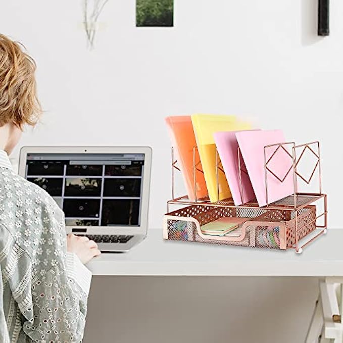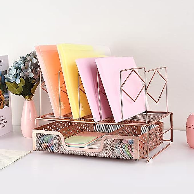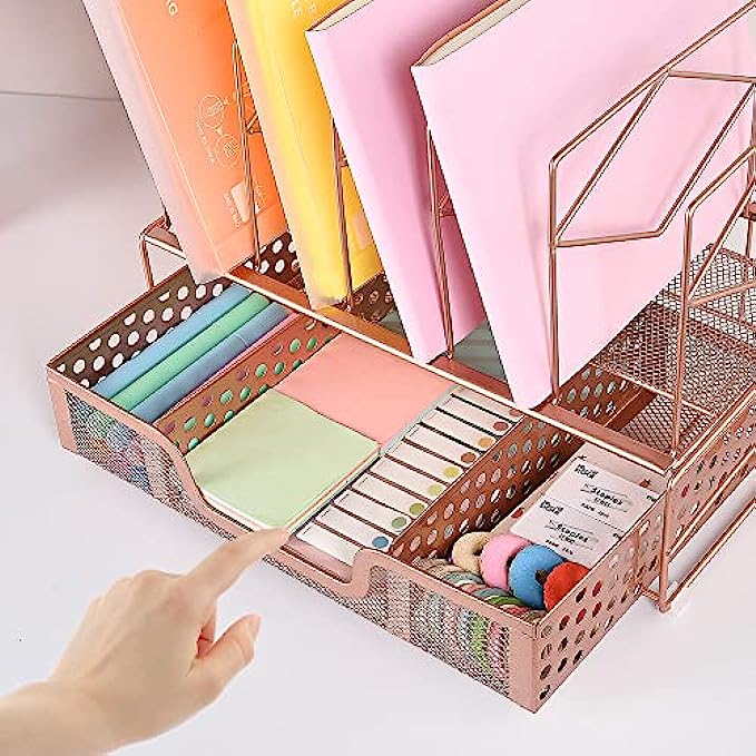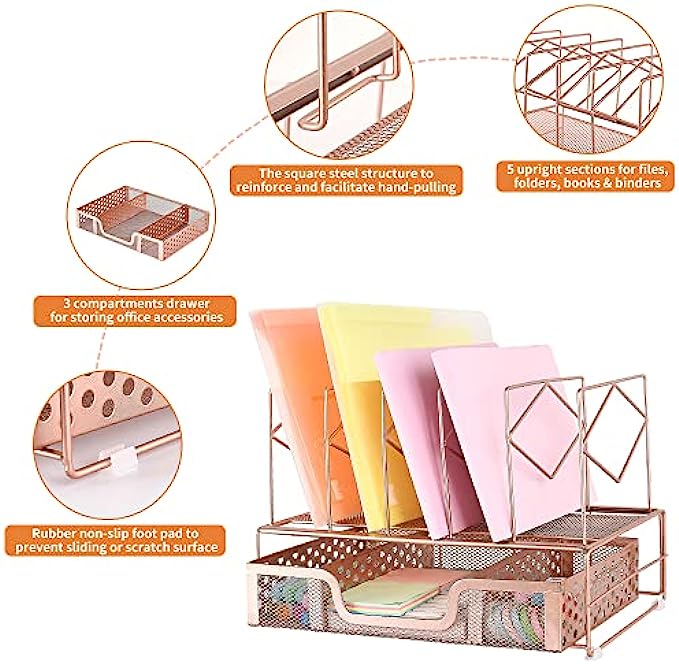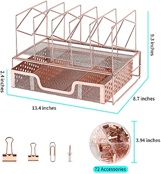 ▶DESK FILE ORGANIZERS STRUCTURE: Desk organizer includes 1 Paper Tray & 5 Upright Slots File Folder Holders + 4 rubber non-slip feet + 1 enlarged sliding drawer with 3 compartments + 1 binder set(rose gold). Easy to assemble in minutes without any tools. Size: 13.4 x 9 x 9.3 inches.