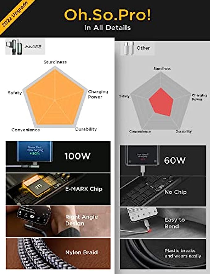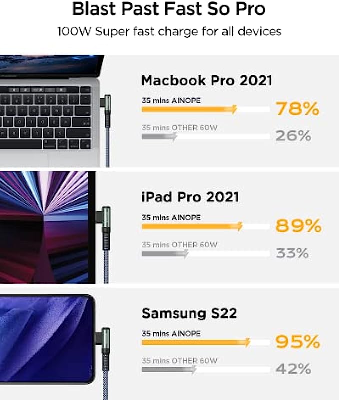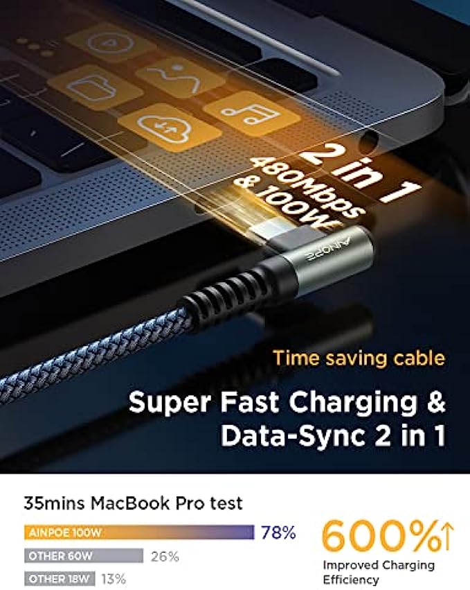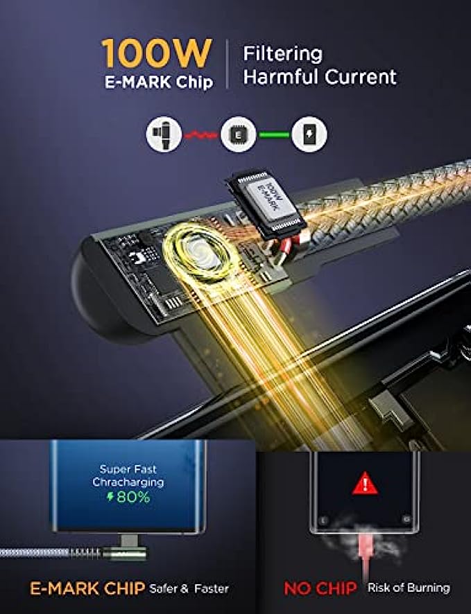 ?2022 Upgrade 100W E-Mark Chip, 6X Faster : 100W super fast charging usb c cable to usb c is built in the best power delivery Certified E-Mark dual chip, which turbo charge supports USB PD fast charging and provides comprehensive protection to devices battery and adapters, keeping you in light-speed charging and safe. AINOPE is born for safe and fast charging. Please note: This 100W USB C cable data transfer needs to pass through the USB 2.0 USB C port.