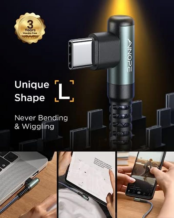 ?"L" Connector Design, Prevent Bending & Breaking: This right angle type c to type c cable fast charge with an innovative 90 degrees "L" design. It's more convenient and comfortable for playing games, watching videos, reading e-books when you charging. A comfortable grip brings you an immersive operating experience, It completely solves the troubles of ordinary wires that are easy to block hand, unintentionally interrupted and the bending of the connector while using while chargin.